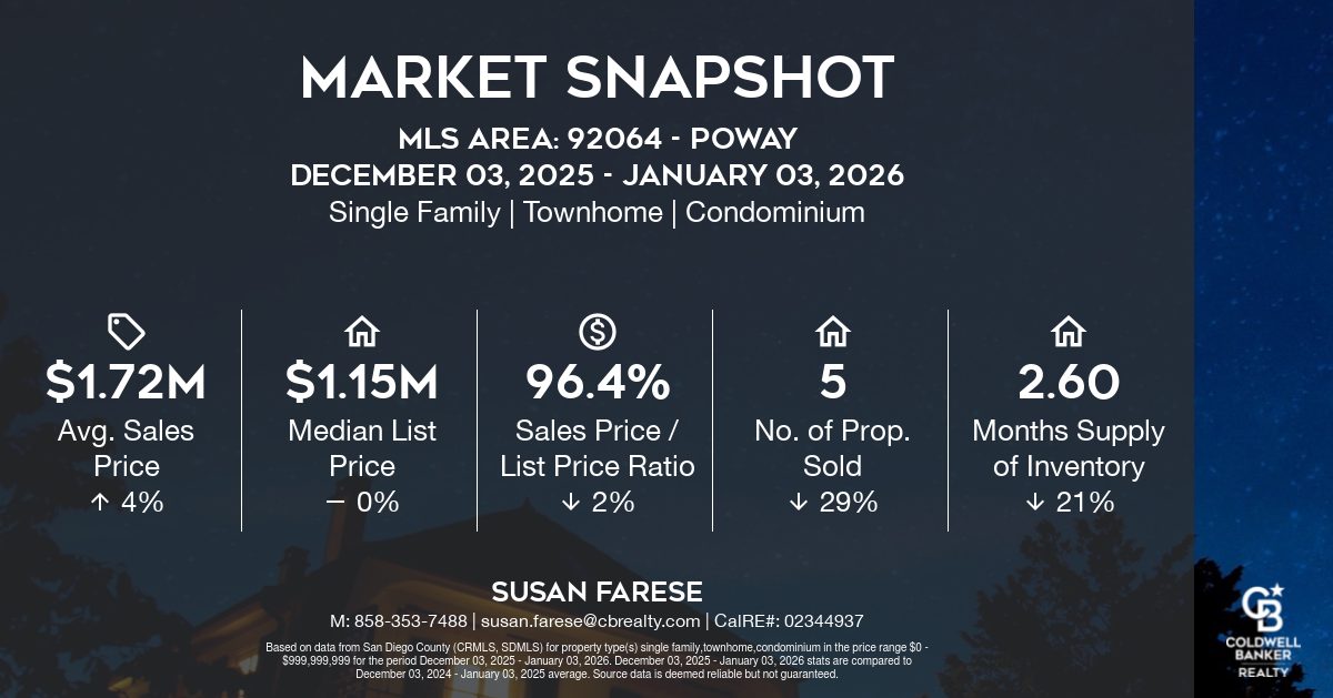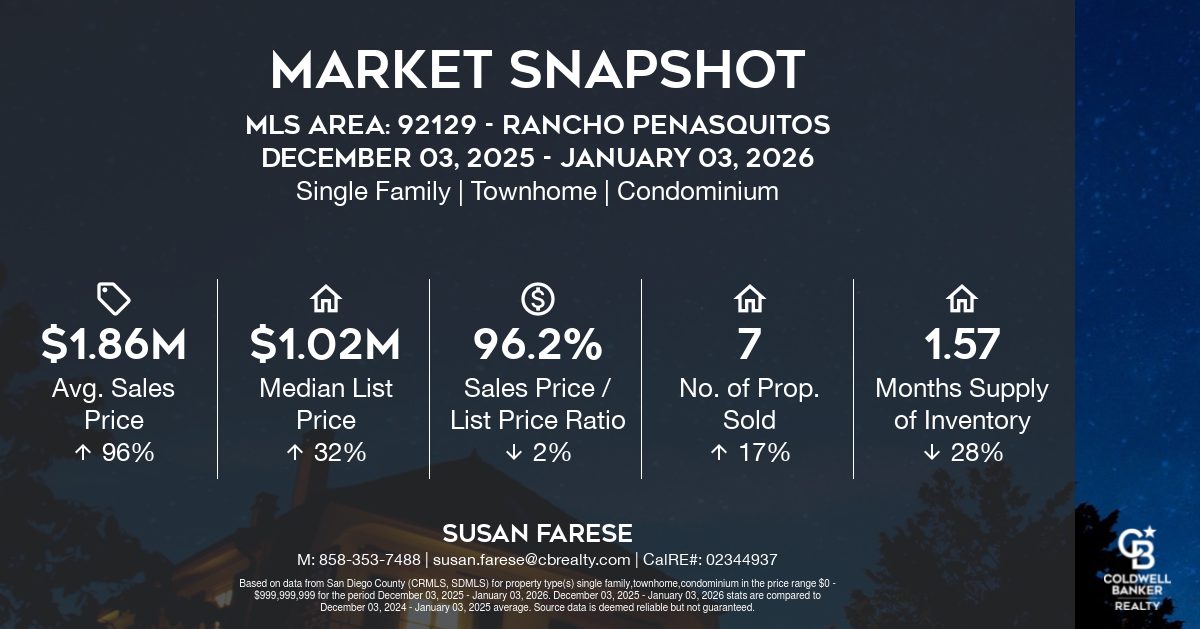 Here is your local market snapshot for selected areas of San Diego County, courtesy of Market Quest. Included are the average sale price, the median list price, the sales price/list price ratio, the number of properties sold and the months supply of inventory. Dates: December 3, 2025 – January 3, 2026